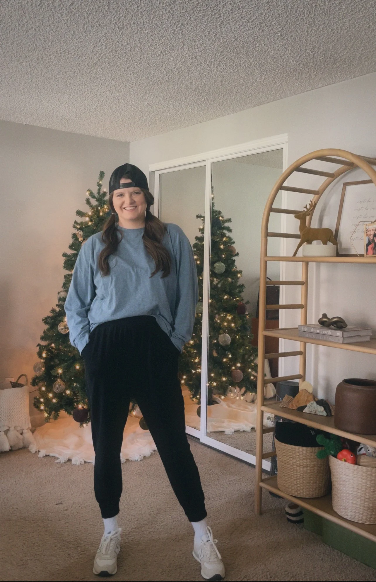 Finally, I had a little fun recreating the classic football outfit from Friends earlier season. I paired some black joggers with an oversized t-shirt and a backwards hat.