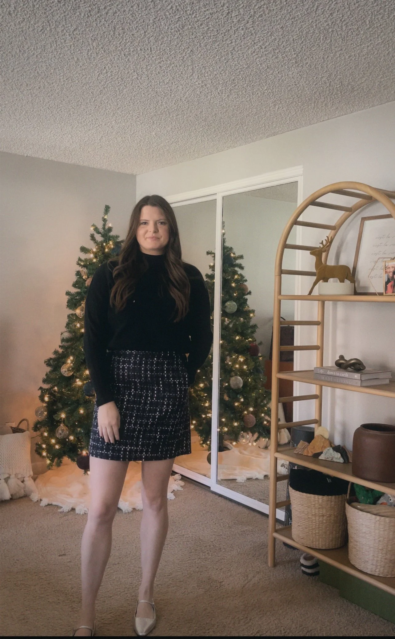 Next Up, is the forever seared in our memory trifle episode where Rachel tries her hand at baking the Thanksgiving dessert. Also forever in my memory is the beautiful red look Rachel serves which baking. I took a classic tweed skirt and a black sweater to recreate this look.