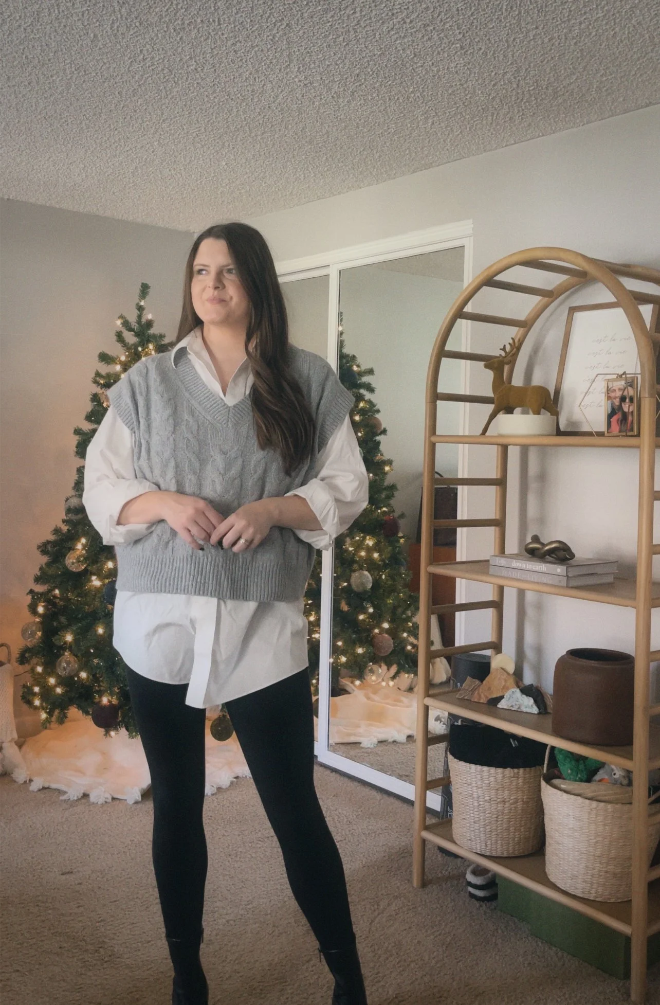 Next up, we have the episode where everyone misses Thanksgiving. Phoebe and Rachel are late due to the beauty pagent they enter Emma in. Rachel rocked the sleek sweater paired with a collared shirt. I recreated this look with a trendy sweater vest and an oversized button up.